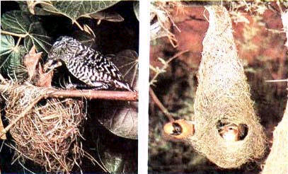 El comportamiento de las especies de aves voladoras es un caso notable. Construyen con esmero los nidos adecuados y esperan el nacimiento de sus polluelos. Éstos nacen completamente indefensos, sin, plumas e incapaces de alimentarse. Sus padres los protegen, los abrigan y les traen el alimento necesario, que los polluelos saben recibir abriendo el pico (respuesta innata). Esto dura hasta que las crías alcancen una edad que les permita alimentarse por sí mismas.