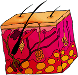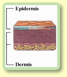 La Dermis Es la capa más gruesa de la piel, está formada por dos estratos que se continúan entre sí, es rica en vasos sanguíneos y terminaciones nerviosas, también posee folículos pilosos, glándulas sudoríparas, sebáceas y músculos elevadores de los pelos. El tejido que forma la dermis es llamado tejido conjuntivo y posee numerosas fibras elásticas y de colágeno que es la principal proteína de la piel. En su parte más profunda presenta abundantes células adiposas o panículos adiposos. |