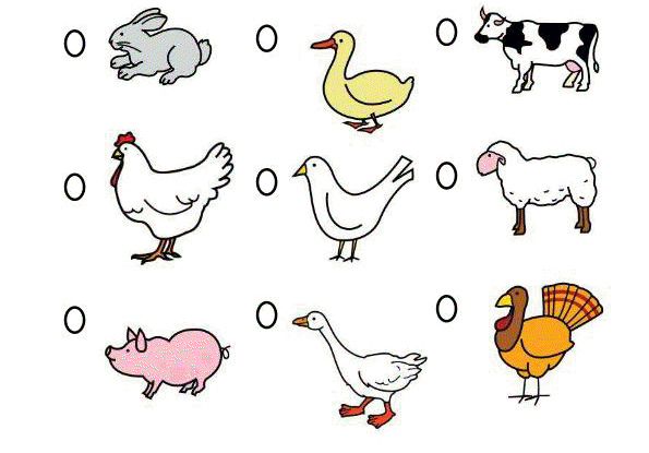 conejo, pato, vaca, gallina, paloma, cordero, cerdo, ganso, pavo...