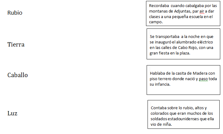 Cuando ella nació, Puerto Rico era todavía una colonia de España. Pero todo cambio tres años más tarde, al entrar en nuestra isla, por la bahía de Guanica, las tropas estadounidenses. Para entonces, los Estados Unidos y España estaba librando la llamada Guerra Hispano-cubano-norteamericana. Cuando finalizo el conflicto, los Estado Unidos y España estaban liberado la llamada Guerra Hispano-cubano-norteamericana. Cuando finalizo el conflicto, los Estados Unido se quedaron con Puerto Rico y otras islas en el océano Pacifico. Además de tener un temperamento animado, mi abuela sabia narra muy bien. Solo había que pronunciar una palabra clave, para que se lanzara a contar alguna de las cientos de historias que guardaba en el archivo de su memoria. Por ejemplo, yo le decía: “İAbuela, rubio!”, y ella se remontaba a principios del siglo XX y se ponía a describir lo rubios, altos y colorados que eran muchos de los soldados estadounidenses que ella vio cuando niña. Si le decía: “İAbuela, tierra!”, hablando de la casita de madera con piso terrero, donde nació y paso toda su infancia. Si yo decía: “Abuela, caballo”, relataba cómo, en la década del veinte, ella cabalgaba por las montanas de Adjuntas, para ir a dar clases a una pequeña escuela en el campo. La historia que mas me gustaba escuchar era la que despertaba en ella la palabra “luz”. De inmediato se trepaba en una máquina del tiempo invisible e iba a dar a su pueblo natal, Cabo Rojo, la noche en que se inauguró el alumbrado eléctrico. Hasta entonces, el poblado se iluminaba con forales de gas, pero esa noche todos los habitantes del pueblo celebraron una gran fiesta en la plaza de recreo y en las calles, porque al fin habían llegado los tiempos modernos, representados por aquellas bombillas de luz debilucha que se encendían solas, sin que el sereno tuviera que acercarles una llama. A veces me imaginaba a Abuela como una computadora siempre conectada a la Internet: uno escribe una palabra, marca “búsqueda” y enseguida aparece en la pantalla la información requerida. O como un robot de esos que pronto habrá en todas las casas: le daremos una orden con una sola palabra, como “İLimpia!”, y en un dos por tres el autómata dejara resplandeciente el hogar. Pero mi abuela no era ni una cosa ni la otra, desde luego. Era simplemente un ser humano a quien le ocurrió lo que nos sucede a todos. Según crecemos, maduramos y envejecemos, vamos acumulando en la mente y en el corazón las experiencias vividas, y si las compartimos con los demás para su bien, entonces nos convertimos en personas sabias. Mi abuela, como todos los ancianos, era un libro viviente de historia. En sus páginas estaba escrita más de un siglo de la biografía de nuestro país: desde los tiempos en que la Isla vivía de la agricultura, hasta el Puerto Rico actual, dominado por las maquinas y todo tipo de tecnologías. Por eso, los ancianos merecen respeto y atención: porque llevan en sus adentro otras épocas de las que solo ellos pueden hablarnos. Cuando mi abuela Marcarolina murió, con ella se fue también toda una era de Puerto Rico. Pero antes de partir, se aseguro de que sus hijos y nietos heredaran su conocimiento, para que nosotros lo pasemos a la nuevas generaciones. Como ocurrió cuando se inauguró el alumbrado eléctrico en su pueblo natal, Abuela no nos dejo en las sombras al abandonar este mundo, sino que encendió una luz en nuestro ser para que, al igual que ella, hiciéramos de la vida una gran fiesta.