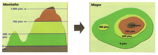 Altura en un mapa Para representar el relieve del terreno en un mapa, se dibujan curvas del nivel. Las curvas del nivel son líneas de colores con las que se representan las diferentes alturas del relieve. La altura de una montañosa puede representarse por medio de las curvas de nivel.