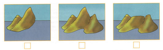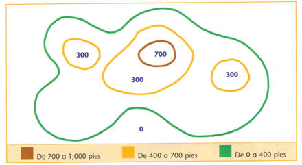 Completa: 1. ¿A qué altitud se encuentra la montaña más alta? 2. ¿Entre que altitudes se encuentran la mayor parte de esta formacion? Entre ______________ y ______________ pies de altitud. B. Marca la forma del relieve que corresponda al mapa del ejercicio A.