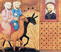 Jesús en un asno y Mahoma en camello cabalgando juntos (miniatura persa).