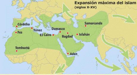 La difusión del islamismo fue rápida y efectiva. Sus años de mayor expansión fueron del 632 al 1050. Los ejércitos árabes –cohesionados por el fervor religioso, así como por incentivos políticos y económicos– tomaron el poder de los regímenes residentes en Siria e Irak (638), Irán (641) y Egipto (642); marcharon hacia el este, en dirección a Asia central, y hacia el oeste a través del norte de África, y para el año 732, el mundo islámico se extendía desde España a las fronteras de India y China. Más tarde lograron otros avances territoriales en África, Asia central, India y en especial Turquía, con la caída, en 1453, de lo poco que quedaba del Imperio Bizantino. En el sureste asiático, a principios del siglo XVI, hubo otra expansión del islamismo.