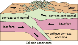 3.- La subducción de las placas de corteza continental, una bajo la otra, que produce grandes cordilleras como el Himalaya. Además, la comprensión de los materiales sedimentados en el borde genera grandes pliegues. |