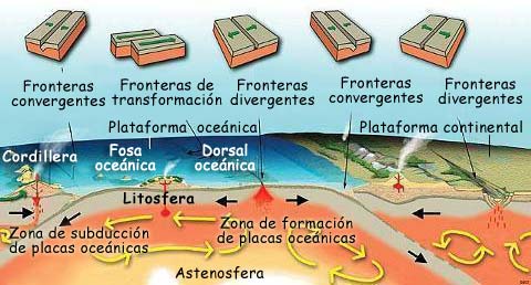 Con este esquema los continentes se comportan de forma pasiva, siendo transportados encima de la corteza oceánica. Así pues, no son los continentes los que se mueven aunque sí son transportados. Y además los fondos oceánicos son mucho más jóvenes, debido a este mecanismo de continua creación y destrucción (máximo 150 millones de años). Para que el radio de la Tierra no se incremente, debido a la expansión de los océanos, además de la creación también debe haber destrucción de la corteza oceánica. Esto es cierto debido a que se ha comprobado en reiteradas ocasiones que cuanto mayor es la distancia de una isla volcánica a la dorsal oceánica más antigua será. Además que las islas volcánicas alejadas de las dorsales están inactivas porque han perdido el contacto con el flujo ascendente del manto; y también son más bajas, ya que están más erosionadas, sin embargo esto es más relativo. El espesor de la litosfera en la corteza oceánica es de unos 50 - 150 kilómetros, mientras que en la corteza continental es de unos 100 - 200 kilómetros. En 1965 Edward Bullard comprobó que la coincidencia entre las costas de los continentes es casi absoluta a una profundidad de unos 2.000 metros. Bullard logró reconstruir idealmente el continente de Pangea, rodeado de un gran océano, Pantalasa, y con un mar que se internaba desde el este, el mar de Tetis. La tectónica de placas no sólo explica los terremotos y los volcanes, sino también, las grandes cadenas montañosas. El contacto entre placas da lugar a tres situaciones: |