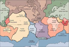 Así pues, una placa es un fragmento rígido de litosfera, es decir la corteza oceánica, la corteza continental y la parte superior del manto. La litosfera está formada por un número reducido de placas más o menos grandes. Estos fragmentos son rígidos, pasivos, inactivos y se mueven sobre el manto. Sin embargo, en la zona de contacto entre placas se rompen generando terremotos, vulcanismo y deformaciones en la corteza continental (orogénesis). Los límites de una placa son: La dorsal oceánica, la fosa oceánica y determinadas fallas transformantes. En una placa se pueden dar tres movimientos: de separación, a lo largo de las dorsales oceánicas, de aproximación a lo largo de las fosas, y de deslizamiento, a lo largo de las fallas transformantes. |