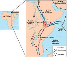 La última gran dorsal, aún en formación, es el valle del Rift, de donde toman el nombre las depresiones de la cima de las dorsales, desde los grandes lagos africanos, hasta el mar muerto. Se considera que en un futuro esa dorsal continúe expandiéndose y forme un nuevo océano. |