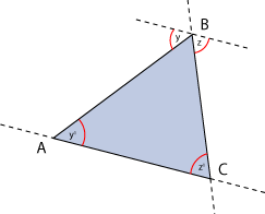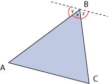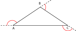 Los ángulos exteriores son aquellos que se forman entre un lado y la prolongación de otro. Por ejemplo: (ver figura a la derecha) |