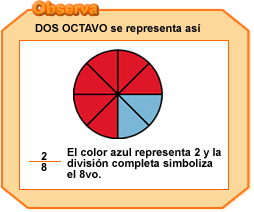 Si tomamos las 3 rosas, representan 3 porciones de las ocho en las que hemos dividido el queso, es decir   3 / 8  del queso, y si tomamos las 5 verdes, representan 5 porciones de las ocho en las que hemos dividido el queso, es decir   5 / 8  del queso.