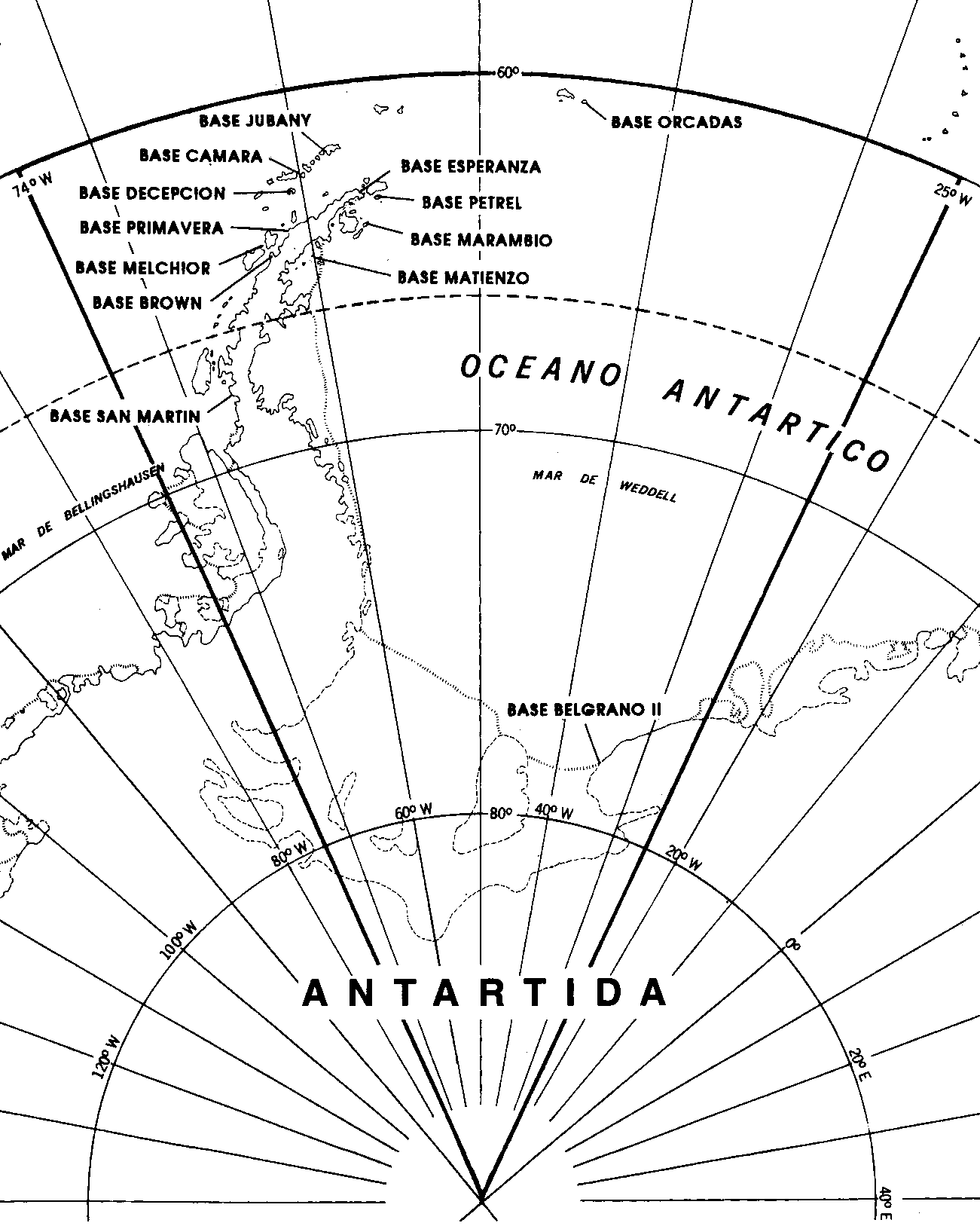 Mostrando los distintos sectores bajo reclamo de diferentes países y la ubicación de sus respectivas bases, incluyendo en detalle su localización
