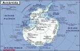 Mapa del continente con detalle de accidentes geograficos destacados, en particular formaciones montañosas, costas y barreras de hielos.
