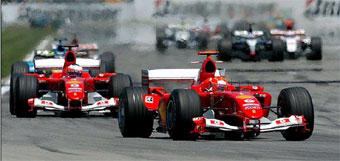 En 1995 repitió triunfo con Benetton y un año más tarde fichó por Ferrari con el objetivo de relanzar el palmarés de la mítica marca italiana. Estuvo durante cuatro años a punto de lograr el triunfo, pero por una serie de razones (entre ellas un accidente en 1999 en el que se fracturó las dos piernas) tuvo que resignarse a acumular victorias parciales hasta el año 2000, temporada en la que se proclamó campeón del mundo, algo que no lograba Ferrari desde 1979. En 2001 no sólo ganó nuevamente el campeonato, sino que obtuvo su victoria número 52 en Grandes Premios y batió el récord que hasta entonces ostentaba el piloto francés Alain Prost. De forma unánime, Schumi logró el reconocimiento internacional como mejor piloto de la historia, una auténtica leyenda situada a un peldaño del histórico Fangio, el piloto argentino que en la década de los cincuenta fue cinco veces campeón del mundo; una gesta sólo al alcance del "Barón Rojo" de la Fórmula 1. Camino de emular a Fangio, Schumacher comenzó el Campeonato del Mundo 2002 con una clara victoria en el G.P. de Australia, la número 54 de su cuenta particular y la tercera consecutiva en el circuito de Melbourne. Después sólo necesitó disputar diez pruebas más, en las que logró otras siete victorias (Brasil, San Marino, España, Austria, Canadá, Gran Bretaña, Francia), dos segundos puestos (Mónaco, Europa) y un tercero (Malaisia), para proclamarse pentacampeón mundial. Igualó así el récord de Fangio pero además logró el título a seis pruebas del final del campeonato y arrebató a Nigel Mansell la marca conquistada en 1992 cuando el británico fue campeón a falta de cinco carreras. El arranque del Mundial 2003 resultó más irregular de lo esperado para el piloto alemán que no logró subir al podio en los dos primeros G.P. del año y, en el tercero, abandonó el circuito; una circunstancia que no protagonizaba desde muchas carreras atrás. Todo cambió en San Marino, cuarta cita del campeonato, donde Schumi logró un triunfo especialmente emotivo pocas horas después de conocer el fallecimiento de su madre en Colonia. Con un golpe soberano de autoridad, también fue primero en Montmeló y en el G.P. de Austria y comenzó a fraguar la consecución de su sexta corona mundial. Volvió a subir a lo más alto del podio en Canadá y, pese a no demostrar la hegemonía de otras temporadas, el piloto de Ferrari se ocupó de puntuar en todos los G.P. para mantener la regularidad necesaria en todo aspirante al campeonato. Dos triunfos consecutivos en Italia y Estados Unidos colocaron a Schumi a un solo punto del título; una posición de privilegio para convertirse en el piloto más laureado de la historia. Todo debía dirimirse en el Gran Premio de Japón, última cita de la temporada, y en el circuito asiático el Barón Rojo cumplió su cometido: fue octavo y sumó a su casillero el punto que le otorgaba el sexto campeonato del mundo de su carrera; los cuatro últimos de manera consecutiva. El 29 de agosto de 2004 sumó un nuevo título mundial a su palmarés, el séptimo, a falta de cuatro pruebas, tras lograr el segundo puesto en el Campeonato de Bélgica, por detrás de Raikkonen. Con un inicio fulgurante, con victoria en las cinco primeras pruebas, Schumacher sumó un total de trece victorias (Australia, Malaisia, Bahrein, San Marino, Montmeló, Nürburgring, Canadá, EE.UU., Francia, Gran Bretaña, Alemania, Bélgica y Japón) y 148 puntos, 34 por encima del segundo clasificado, Barrichello. Destacan además sus nueve poles, marcas todas que acreditan un excelente año y que encumbran aún más al piloto de Hürt-Hermülheim como uno de los mejores pilotos de todos los tiempos. Polémico y disciplinado Si como piloto es un dechado de virtudes, a nivel humano su comportamiento está envuelto en la polémica. Siempre alegre y extravertido, parece más un latino que un germano, pero su engreimiento y su carácter altivo le ha perjudicado en sus relaciones con sus colegas de profesión e incluso con los periodistas alemanes. Le robó la novia, Corinna, a su amigo Heinz-Harald Frentzen, otro prometedor piloto de la nueva escuela alemana; no da un paso si no hay dinero por delante, y es extremadamente exigente con su imagen externa, hasta el punto que en una ocasión solicitó cuatro monos distintos y ninguno le satisfizo porque apreciaba alguna pequeña arruga.