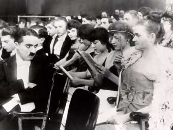 Ya en 1919 Chaplin, Pickford y Fairbanks, junto al director David W. Griffith (sin duda otro genio del cine) habían constituido la productora independiente United Artists, pero Chaplin no trabajó para ésta hasta no acabar su contrato con la First National. En 1923, con productora propia, sólida fortuna personal y una suntuosa mansión en Beverly Hills, se sintió al fin con las manos libres para desarrollar sin ataduras su creatividad. Ese año dirigió, sin actuar, la excelente A Woman of Paris, con su admirada Edna y Adolphe Menjou. El multifacético creador tenía ya treinta y cinco años, y el 24 de noviembre de 1924 contrajo matrimonio en México con la jovencísima actriz Lolita McMurray (o Lita Grey), de sólo dieciséis años. La unión duró hasta 1927 y Chaplin obtuvo de ella sus dos primeros hijos (Charles Spencer y Sydney Earle) y pagó un millón de dólares al divorciarse de su Lolita. En esa época inició la gran trilogía final del personaje de Charlot, rodando en 1925 The Gold Rush (La quimera del oro), de la que en 1942 realizó una versión sonora narrada por su voz y con música propia. Ya en 1927 se estrenó la primera película sonora, El cantor de jazz, con Al Jolson, pero Chaplin seguía fiel al cine mudo cuando en 1928 realizó The circus (El circo), película que él mismo consideraba menos lograda que las que integraban la trilogía, pese a ser un magnífico filme cómico. Por esta película recibió su primer Oscar de la Academia en 1929. Dos años más tarde estrenó City Lights (Luces de la ciudad), paradigma de la ternura y la desolación de su alter ego cinematográfico, con inclusión de escenas sonoras y música de Chaplin. En 1932 realizó un nuevo y extenso viaje a Europa, donde en una recepción conoció a la actriz francesa Paulette Goddard. Ambos prosiguieron juntos el itinerario de lo que llegó a ser una gira mundial, y al año siguiente Paulette sería su pareja en el último film de la trilogía: Modern Times (Tiempos modernos), una ácida parábola sobre el maquinismo industrial y las miserias del capitalismo. Al desatarse la guerra y la invasión alemana sobre Europa, Chaplin filmó, en 1940, The Great Dictator (El gran dictador), una divertida y feroz parodia del nazi-fascismo, en la que el actor se desdoblaba en un Charlot transformado en peluquero judío y un Hitler mitómano y paranoico que anunciaba la disposición de Chaplin a encarnar nuevos roles, sin bombín ni zapatones. Lo acompañaba la Goddard, cuyo personaje llevaba el nombre de la madre de Charles (Hannah), fallecida en 1928. Chaplin y Paulette se distanciaron en 1941 y poco después el cineasta se vio envuelto en un proceso por la paternidad de la hija de la actriz Joan Barry, llamada Carol Ann. Condenado en abril de 1942 por violación de la Ley Mann, debió hacerse cargo de la manutención de la niña. El escándalo no le impidió casarse a sus cincuenta y cuatro años, con la hija del insigne dramaturgo Eugene O'Neill, una hermosa joven de dieciocho años llamada Oona, que permanecería a su lado el resto de su vida. El patriarca de Vevey Tras rodar Monsieur Verdoux en 1947, Charles Chaplin cayó bajo la ola del maccarthismo que tenía como blanco a intelectuales y artistas de Hollywood. La crítica social que rezumaba su obra, sumada probablemente a su origen judío y al hecho de ser extranjero (nunca se nacionalizó), lo llevaron a comparecer en 1949 ante el inquisicional Comité de Actividades Antinorteamericanas. Al año siguiente, mientras él y su familia viajaban por Europa, se ordenó a las autoridades de inmigración que lo retuvieran a su regreso. Chaplin decidió no volver jamás y se instaló en una lujosa residencia en Corsier-sur-Vevey, en la plácida ribera del lago suizo de Léman, frente a Ginebra. Oona se encargó de liquidar sus asuntos económicos y profesionales en Estados Unidos. Inglaterra ofreció a su hijo pródigo un sitio para continuar su trabajo. En 1952 rodó en Londres Limelight (Candilejas), magnífica y sentimental rememoración de sus días de cómico ambulante, y dos años más tarde recibió el Premio Internacional de la Paz. Su resentimiento contra Estados Unidos se reflejó en A King in New York (Un rey en Nueva York), filme de 1957 cuyos altibajos no ocultan el corrosivo humor chapliniano. El gran cineasta era ya un anciano patriarcal y vitalista que comenzaba a escribir sus memorias en 1959. A los setenta y ocho años fue padre de su octavo hijo con Oona, Christopher, nacido en 1962, y en 1964 se publicó en Londres su autobiografía, Historia de mi vida.