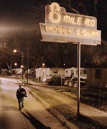 Por la noches, alimentan sus esperanzas en los clubes de hip hop de Detroit. En ellos se dan cita los mejores raperos y luchan en desafíos verbales rimados y ofensivos para ganarse el respeto de sus camaradas. El ingenio más veloz e incisivo es el que vence. El filme, dirigido por el prestigioso Curtis Hanson (L.A. Confidential), cuenta con la participación de la mítica Kim Basinguer en el papel de Stephanie, madre de Jimmy Smith Jr. (Eminem). Su relación es tan tormentosa en la ficción cinematográfica como lo ha sido en la verdad biográfica. Naturalmente, la banda sonora corrió a cargo del propio Eminem. Incluye tres canciones inéditas, entre las que destaca la famosa Lose yourself.