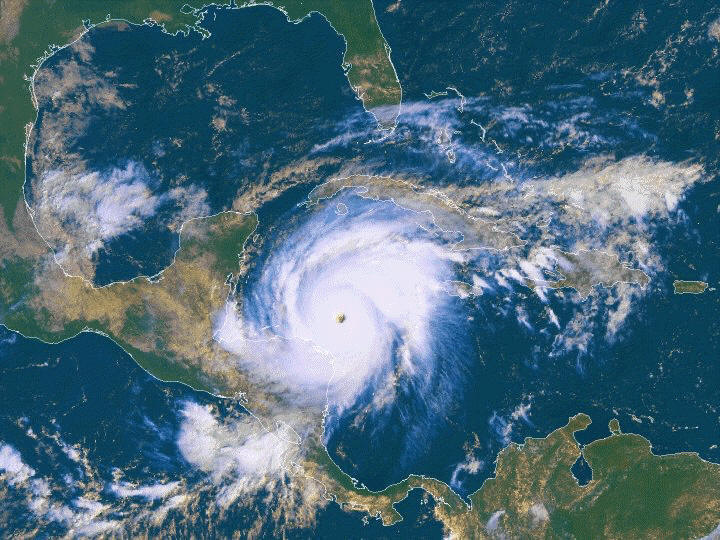 Fig. 6 Imagen del huracán Mitch cuando alcanzó la categoría 5. Se observa claramente el ojo y la pared del mismo. Nótense las bandas de lluvia que confluyen alrededor del centro del sistema. El ojo es oscuro ya que es una zona que no tiene nubes, lo que se observa entonces es la superficie del mar. El huracán Mitch es un reflejo de la alta organización que pueden llegar a alcanzar este tipo de ciclones tropicales, surgido de un sistema de baja presión, encontrando a su paso el ambiente favorable para su intensificación y organización tanto física como dinámicamente. Cambios en la estructura del ojo y de la pared del ojo pueden causar cambios en la velocidad del viento del huracán.El ojo puede cambiar de tamaño a medida que el huracán recorre las aguas oceánicas. Las bandas de lluvia exteriores al huracán a menudo tienen vientos con fuerza de huracán o tormenta, pueden extenderse algunos cientos de kilómetros del centro y tienen un ancho de algunos kilómetros hasta 145 kilómetros y varían entre 80 y 480 kilómetros de largo.El tamaño típico (diámetro) de un huracán es de 480 kilómetros de ancho, aunque este valor puede variar considerablemente. El tamaño no es un indicador, necesariamente, de la intensidad del huracán. La fuerza de los vientos huracanados puede extenderse hacia afuera de su centro alrededor de 40 kilómetros, si es un huracán pequeño, y más de 240 kilómetros si es grande, alcanzando, en ciertas ocasiones, hasta 500 kilómetros.El huracán puede cambiar rápidamente de forma, tamaño, intensidad, velocidad de traslación y dirección de desplazamiento La velocidad y la trayectoria de un huracán dependen de complejas interacciones entre éste la atmósfera y el mar: típicamente un huracán se desplaza a una velocidad de 24 a 32 kilómetros por hora.Como regla general el lado derecho del huracán (relativo a la dirección de su desplazamiento) es la parte más peligrosa del mismo debido a que a su velocidad se le suma la velocidad de la corriente de viento en el cual éste está embebido (ver fig. 9). El incremento de la velocidad del viento en el lado derecho del sistema aumenta la marejada generada. Además, los tornados son más frecuentes en esta parte del sistema.