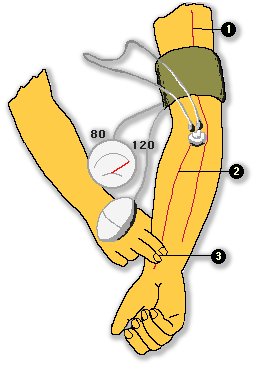 Esta figura grafica el procedimiento que se utiliza para medir la presión arterial. El manguito que se aplica al brazo es para obstruir la circulación en arteria humeral y luego auscultar con el fonendoscopio la pasada de sangre. (presión máxima o sistólica) y el momento que no se escucha más el flujo turbulento (presión mínima o distólica). |