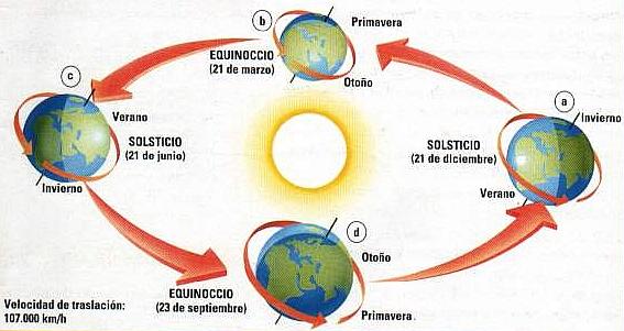 • El movimiento de traslación: la Tierra describe alrededor del Sol una elipse en 365 días, 6 horas y 9 minutos, en un plano llamado eclíptica. La inclinación del eje terrestre hace que los rayos solares incidan más o menos en una zona a lo largo del año, produciendo una desigualdad de los días y de las noches y determinando las estaciones. En el ecuador no existe tal modificación.