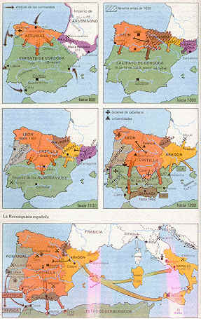 El Reino de León, estaba formado en el siglo X por Galicia, Asturias, León y Castilla. En tiempos de Ordoño II (914-924), se produjo la ocupación temporal de León por Abderramán III en el año 920, fecha en la que también se conquistó La Rioja con ayuda de los navarros. Posteriormente, los pamploneses intervinieron en la sucesión al trono leonés, imponiendo a Alfonso IV (925-931) y Ramiro II (931-951). Tras la batalla de Simancas (año 939), en la que el rey Ramiro II derrotó a los musulmanes, se produjo la repoblación de Sepúlveda y de la cuenca del río Tormes. Los sucesores, Ordoño III (951-956) y Sancho I (956 - 966), fueron monarcas impuestos por la facción navarra, cuya influencia culminó con la subida al trono de Ramiro III (966-984). En este reinado se registraron los ataques dirigidos por Almanzor que supusieron el retroceso de las avanzadillas de los ejércitos cristianos. Las actividades económicas siguieron siendo rudimentarias y no existió acuñación de moneda hasta el reinado de Vermudo II (984-999). En este siglo se produjo un auge de la cultura mozárabe, y como ejemplos podemos citar la realización de la Biblia Hispalense y del Códice Virgiliano. También hay que resaltar las importantes obras en la arquitectura de estilo mozárabe. Respecto al siglo XI, cabe reseñar la desintegración del Califato en torno al año 1030, después de la retirada del apoyo que recibía de la burguesía cordobesa. Por ello, Córdoba dejó de jugar su papel principal y Al-Andalus quedó fragmentado en Estados independientes llamados Reinos Taifas, que se caracterizaban por las discordias internas continuas. Ahora bien, la desintegración del Califato de Córdoba favoreció el renacimiento económico cristiano gracias a las parias, que eran los tributos de los reinos taifas a cambio del respeto a sus fronteras por los reinos cristianos. De esta forma, el oro recibido de las parias era repartido por los reyes cristianos entre los diferentes nobles y personalidades del alto clero, a los que sirvió para comprar las tierras entregadas a los labriegos y pastores en los siglos anteriores. Esta concentración de la propiedad condicionó el desarrollo económico y político a partir de la Baja Edad Media. El Reino de Navarra sufrió varias modificaciones durante este siglo XI. A principios del siglo, comprendió los territorios de Castilla, León, Navarra y Aragón. Durante el reinado de Sancho El Mayor (1000-1035), se produjo el sometimiento de la Iglesia a las normas de Roma con la reforma benedictina, base de la cluniacense. A la muerte del monarca Sancho Garcés IV, en 1076, el reino navarro se dividió entre castellanos y aragoneses. En Castilla se pasó de condado, hereditario desde finales del siglo X, a reino bajo Fernando I (1032-1065), hijo segundo de Sancho el Mayor. Durante este primer reinado se ejerció una fuerte influencia sobre León. No obstante, sus sucesores, Sancho II y Alfonso VI, comenzaron a padecer las imposiciones de la nobleza y de la Iglesia. Asimismo, la enorme riqueza de la institución eclesiástica favoreció el auge de las edificaciones de estilo románico. Por su parte, el Reino de Aragón se constituyó con Ramiro I, hijo bastardo de Sancho el Mayor, en el año 1035. El desarrollo de este reino fue paralelo al castellano, con los monarcas Sancho I y Pedro I. También tenemos que resaltar que durante el siglo XI el condado de Barcelona se independizó de la monarquía franca. Esto tuvo lugar en el año 1018 con Berenguer Ramón I. En conjunto las conquistas cristianas prosiguieron con las incursiones castellanas, aragonesas y navarras, que llevaron la frontera hasta las cuencas del río Tajo en la zona occidental y del río Ebro en la oriental. Ahora bien, tras la batalla de Sagrajas, en 1086, los almorávides pusieron freno a la expansión cristiana con la victoria ante las tropas del rey castellano Alfonso VI. De este modo, los almorávides ocuparon los reinos taifas andaluces, portugueses y extremeños que un año antes habían conquistado los castellanos. Entre el 1103 y el 1115, los almorávides consiguieron restablecer la unidad de Al-Andalus después de acciones de conquista y asedios por parte de aragoneses y castellanos. Éstos últimos contaron con los servicios del Cid Campeador, que logró ocupar Valencia para Pedro I.