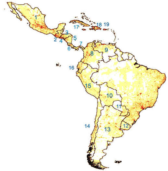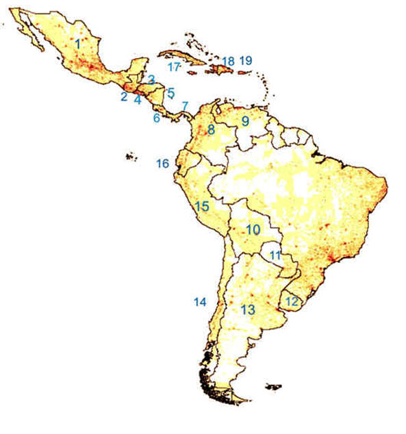 II. Contexto geográfico.  Identifica todos los países de lengua española en este mapa de América.  (19 puntos)