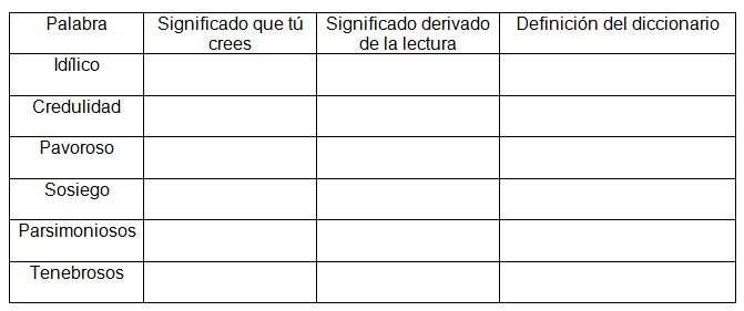 B. Completa la tabla para trabajar el vocabulario. Sin consultar en ninguna fuente, indica qué significado crees que tiene la palabra. Luego de leer la historia, indica el significado que se deriva de ésta. Finalmente, usa el diccionario para la definición.