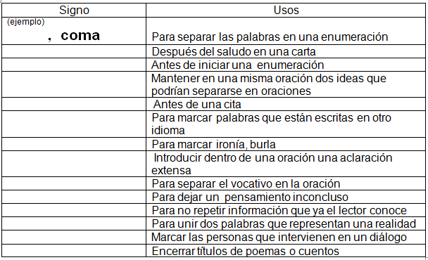 A. Antes de buscar información relacionada con los signos de puntuación, completa la tabla a continuación para identificar algunos de sus usos. B. Luego visita la página http://www.reglasdeortografia.com/signos.htm y contesta todos los ejercicios C. Revisa nuevamente la tabla para que corrijas los errores (26 PUNTOS)