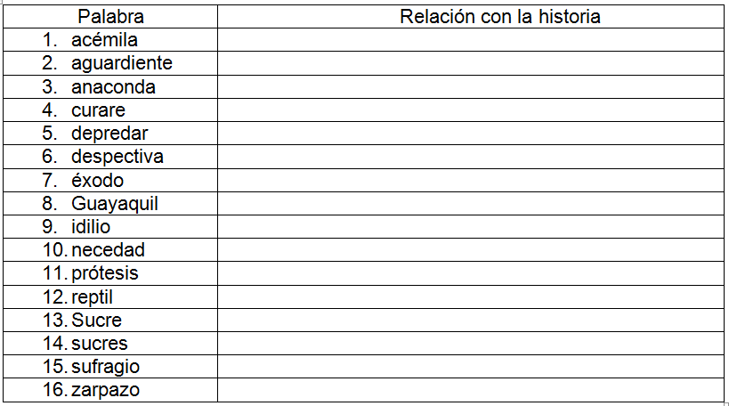 1. acémila 2. aguardiente 3. anaconda 4. curare 5. depredar 6. despectiva 7. éxodo 8. Guayaquil 9. idilio 10. necedad 11. prótesis 12. reptil 13. Sucre 14. sucres 15. sufragio 16. zarpazo