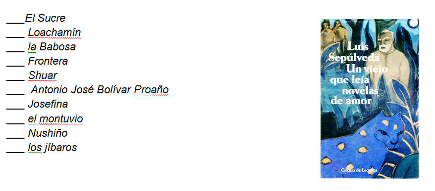 A. aguardiente del lugar B. dentista, trae las novelas de amor C. nombre del barco D. nombre del viejo que leía novelas de amor E. el alcalde, sudaba mucho F. nativos que se habían asimilado a los blancos G. nativos que no se habían asimilado a los blancos H. prostituta que seleccionaba las novelas de amor I. Shuar que muere a manos de un colono, amigo de Antonio José J. Solamente, para ganar una apuesta, permitió que le sacaran los dientes