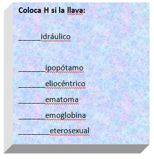 Coloca H si es necesario. 17. _____ ectolitro 18. _____exágono 19. _____eptasílaba 20. _____ovario 21. _____emiplejía 22. _____ipermercado 23. _____omónimos 24. ______idrocefalia, 25. ______idratar 26. _______orfanatorio