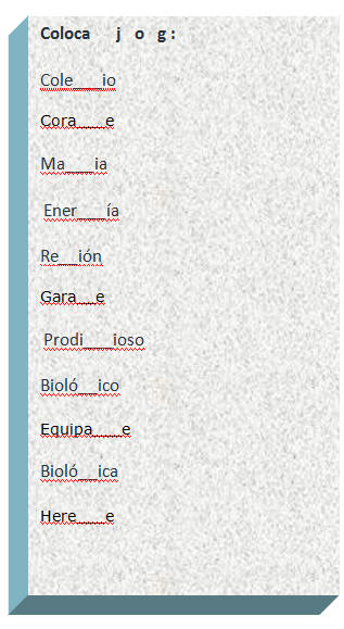 Coloca G o J 27. Ener___ía 28. Re__ión 29. Gara__e 30. Prodi___ioso 31. Bioló__ico 32. Equipa___e 33. Bioló__ica 34. Here___e