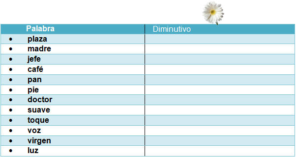 Práctica: Escribe el diminutivo de las siguientes palabras: