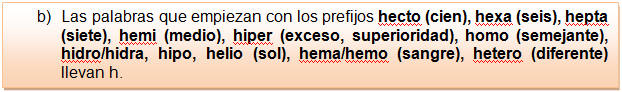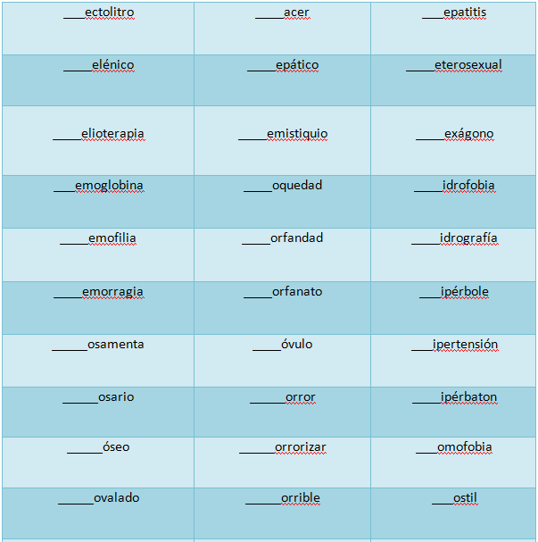 hidráulico, hipertenso, hectolitro, hexágono, heptasílaba, hemiplejía,