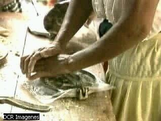 El maíz es el alimento básico de las culturas americanas. Desde el periodo neolítico se utiliza el metate (del náhuatl 'metlatl'), piedra rectangular sostenida en tres pies que se coloca en el piso y que consta además de una especie de rodillo para moler el maíz, el cacao y otros granos. Hoy todavía encontramos algunas mujeres mexicanas que siguen usando el metate en sus cocinas. En alimentación, el maíz se sancocha (cuece) en agua con cal para después molerlo y adaptarlo a diversas formas, como los tamales o las tortillas, las más populares. Aquí vemos a un grupo de indígenas mexicanas, probablemente del occidente de México, elaborando la masa y haciendo tortillas de manera casi industrial. Las tortillas son redondas, de unos 20 cm de diámetro y 2 o 3 mm de grosor. Al salir del tortillero las mujeres las cuecen en un gran comal (plancha) y después de darles la 'vuelta y vuelta' -durante unos segunditos- están listas para comer con diversos ingredientes, ya sea en forma de 'taco', 'sope', 'quesadilla', o simplemente enrolladita tal cual. ¡Qué ustedes aprovechen! |