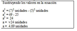 Encontrar el valor del cateto a de un triángulo rectángulo en donde el valor del cateto b es igual a 5 unidades y el valor de la hipotenusa es igual a 7