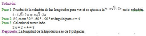 Triángulo 300-600-900 En un triángulo de 300-600-900 la medida de la hipotenusa es de dos veces la medida del lado más corto. Las medida del lado más largo es √3 veces la medida del lado más corto.