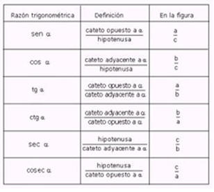 Las tres razones trigonométricas básicas son el seno, el coseno, y la tangente. Éstas se abrevian como sen, cos y tan