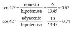 Para el ángulo de 42°, el cateto opuesto tiene una longitud de 9 y el cateto adyacente tiene una longitud de 10.