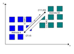 2- Construcción de una vía rápida En una ciudad, las calles van de norte a sur y las avenidas de este a oeste. Las calles y avenidas tienen 750 pies de separación entre sí. El gobierno de la ciudad desea construir una vía rápida desde el cruce de la Calle 21 con la avenida 4, hasta el cruce de la Calle 111 con la avenida 60. ¿Qué longitud tendrá la vía rápida? |