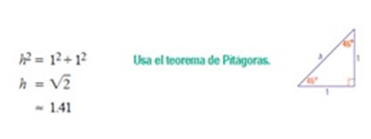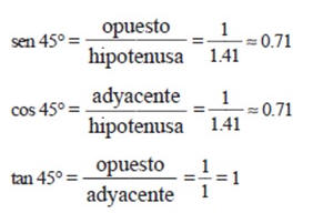 Ejemplo 2: cuáles son el seno, coseno y tangente de 45° El triángulo de 45° tiene dos lados de 1 e hipotenusa √2: