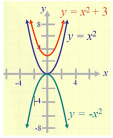 La gráfica de y= x^2+ 3 .   Es la gráfica de y=x^2 que se ha movido tres unidades verticalmente. Esto se conoce como desplazamiento vertical