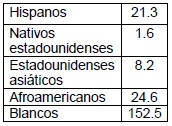 A. {Hispanos, 21.3, Nativos, 1.6, Asiáticos 8.2}