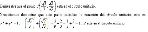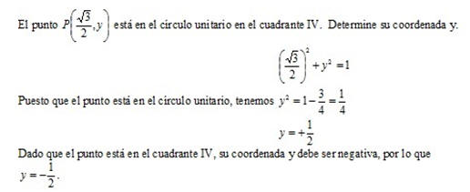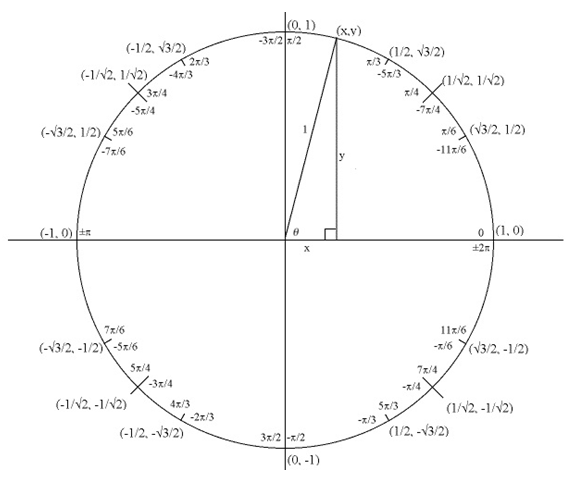 Círculo unitario con los valores de las coordenadas para los ángulos principales