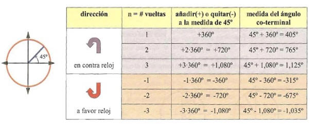 Ejemplo: En la siguiente tabla se incluyen 6 ángulos coterminales al ángulo que mide 45°, tres de ellos tienen medidas positivas y los demás tienen medidas negativas.