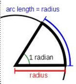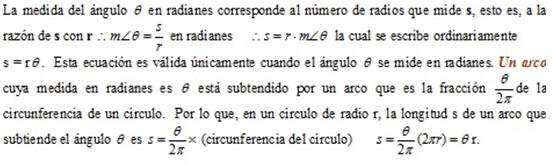 Otra manera de medir ángulos en en radianes. Se dice que un ángulo mide un radian, cuando su medida es equivalente a la longitud de arco formada cuando el lado terminal de dicho ángulo interseca la circunferencia de un círculo de radio r.