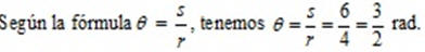Ejemplo: Un ángulo central en un círculo de radio igual a 4m está subtendido por un arco de longitud igual a 6m. Obtenga la medida de en radianes.