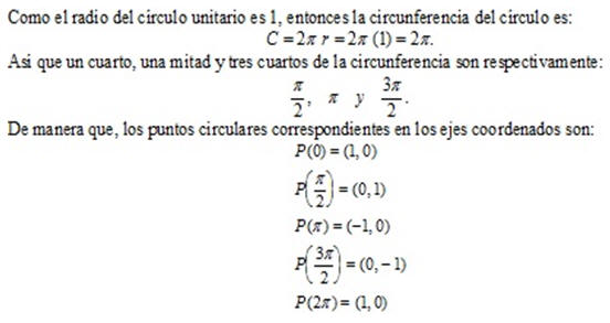 El círculo unitario es un círculo de radio 1 centrado en el origen del plano cartesiano. Su ecuación es . Cada número real de la recta numérica se asocia con las coordenadas de un punto en el círculo unitario llamado punto circular.