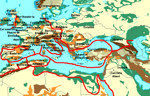 ![]() En México, los mixtecas de las montañas empezaron a enfrentarse a los zapotecas que habitaban en los valles. Su cultura había avanzado notablemente. Eran excelentes orfebres: trabajaban en plata, oro, cobre y algunas aleaciones. La cultura maya inició un rápido proceso de decadencia del que no se conocen las causas. Se especula con un posible agotamiento de las tierras, o bien la aparición de la malaria, o bien desórdenes sociales en contra de la clase sacerdotal, o tal vez el declive se produjera a causa de influencias externas. Unos años antes, Offa había impuesto como rey de Wessex a Beorhtric, para lo cual había tenido que expulsar a otro miembro de la casa real llamado Egberto. Éste había buscado refugio entre los francos y había servido a Carlomagno en su corte durante los tres últimos años. Pero Beorhtric murió en 802 y Egberto volvió rápidamente a su patria donde, como único miembro de la casa real, fue proclamado rey. La muerte de Beorhtric también permitió al Papa León III deshacer lo que unos años antes se había visto obligado a hacer: el arzobispado de Lichfield, en Mercia, fue abolido y Canterbury volvió a ser la cabeza de la Iglesia en Inglaterra. En Asia, Jayavarman II se convirtió en rey del Chen-la de las aguas, se anexionó la otra mitad del reino e instaló su capital en Mahendraparvata. Instauró el culto a Devarajá, el dios-rey, amo y creador del país. Mientras tanto, el Emir de Al-Ándalus Al-Hakam I no acababa de dominar su territorio. Después de haber resuelto la rebelión de sus tíos, en Zaragoza se le rebeló Musá ibn Fortún, que pertenecía a una influyente familia de muladíes conocida como los banú Qasí. Este nombre viene de Cassius, un conde visigodo del valle del Ebro que se convirtió al islam tras la conquista musulmana para conservar sus tierras (banú Qasí significa "hijos de Cassius"). Musá ibn Fortún era su nieto y había ayudado a Hisam I en las luchas que se produjeron tras la muerte de Abd al-Rahmán I. Estaba casado con la viuda de Íñigo Jiménez, un caudillo vasco, y su hermano, Mutarrif ibn Musá, había sido gobernador de Pamplona, la ciudad más importante de Navarra, donde murió dos años antes de que la tomaran los francos. El gobernador de Huesca, llamado Amrús ibn Yúsuf, logró, no sin gran trabajo, someter a Musá, que murió ese mismo año. El rey Alfonso II de Asturias fue derrocado por unos conspiradores y encerrado en un monasterio, pero poco después sus partidarios lograron devolverle la corona. La Emperatriz Irene planeó reconstruir la unidad de Imperio mediante una boda con Carlomagno. Se iniciaron negociaciones con el emperador franco, pero los militares, desde siempre opuestos a Irene, consideraron que la reacción adecuada ante la usurpación del título imperial por parte del monarca franco no era una boda sino una guerra. Por ello las negociaciones se interrumpieron cuando una conspiración de generales bien organizada secuestró a Irene y la recluyó en un convento en la isla de Lesbos (donde murió al año siguiente), al tiempo que era nombrado emperador el que había sido su tesorero, Nicéforo I. Inicialmente tuvo que complacer a los generales que le habían puesto en el trono y declarar la guerra a Carlomagno, pero se las arregló para terminar la guerra cuanto antes. No le fue difícil, pues Carlomagno tampoco estaba interesado en la guerra. En 803 ambas partes firmaron una paz en la que Carlomagno reconocía el dominio bizantino sobre el sur de Italia y la costa de Iliria, así como sobre la ciudad de Venecia, que estaba totalmente rodeada por territorio franco, pero cuyos habitantes habían preferido mantenerse fieles a Constantinopla. Por su parte, Nicéforo I no reconocía el título imperial de Carlomagno. En resumen, Carlomagno aceptó que Constantinopla se quedara con lo que ya era suyo, pero el acuerdo satisfizo a los bizantinos y la guerra terminó. Así Nicéforo pudo dedicarse a restablecer las finanzas del estado, descuidadas por Irene mientras se ocupaba de cuestiones religiosas. Ello supuso aumentar los impuestos, especialmente a la iglesia, lo que le valió la enemistad de los monjes. Nicéforo I también fortaleció el ejército decretando el alistamiento obligatorio de los campesinos pobres. Sin embargo, Carlomagno estableció una alianza con el Califa Harún al-Rashid. Era natural, pues tenían los mismos enemigos: el Imperio Bizantino por una parte y el Emirato Omeya por la otra. El Imperio Franco y el Califato Abasí estaban demasiado alejados para una cooperación efectiva, pero mera existencia de esta alianza era motivo suficiente para inquietar a Constantinopla. Los Barmakíes cayeron en desgracia en la corte de Bagdad. Yafar, el hijo del primer ministro Yahyá y hasta entonces amigo íntimo del Califa, fue ejecutado inmediatamente, y otros miembros de la familia fueron llevados a prisión. Pese a ello, la influencia persa se mantuvo presente en el califato Abasí. En 804 se sometieron a Carlomagno los últimos ávaros rebeldes. A partir de este momento los ávaros desaparecieron de la historia, diluyéndose rápidamente entre la población eslava que antaño habían oprimido. El conde Guillermo de Tolosa se retiró a una abadía benedictina. Ese año murió Alcuino de York. En 805 Nicéforo I obtuvo una victoria importante frente a los eslavos, tras la cual inició una política de colonización que le permitió restaurar el dominio bizantino en los Balcanes. Entonces se consideró preparado para enfrentarse a los musulmanes y envió una carta a Harún al-Rashid notificándole que iba a dejar de pagar el tributo anual. La respuesta del Califa es un modelo de diplomacia. El texto completo decía: En nombre del Dios misericordioso, Harún al-Rashid, jefe de los fieles, a Nicéforo, perro romano. He recibido tu carta, hijo de infiel, y no escucharás mi réplica, sino que la verás.El Califa organizó rápidamente una invasión de Asia Menor, hizo ret