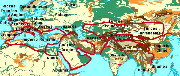 cristianos. El noble visigodo Froya se sublevó contra Chindasvinto con la ayuda de los vascos, y logró poner sitio a Zaragoza. La rebelión fue aplastada por Recesvinto. En 652 murió el rey lombardo Rotario, y fue sucedido por Rodoaldo. Los ataques del Papa Martín I contra el monotelismo colmaron la paciencia del emperador Constante II, el cual lo hizo detener en la basílica de Letrán y en 653 fue conducido a Constantinopla. Allí fue condenado a ser descuartizado por el delito de lesa majestad, pero finalmente fue exiliado a los confines del Imperio, a la península de Crimea, al norte del mar Negro. El emperador marchó a Armenia, donde logró ciertas victorias, pero no pudo conquistar la parte de Armenia que había sido persa. Ese mismo año murió el rey visigodo Chindasvinto y, según lo dispuesto, fue sucedido por su hijo Recesvinto. El nuevo rey convocó el VIII Concilio de Toledo, en el que trató de conciliar el perdón real con las severas leyes dictadas por su padre. De nuevo se estableció que en lo sucesivo serían los obispos y los nobles los que elegirían al rey. También murió el lombardo Rodoaldo, que fue sucedido por Eriberto I. En 654 Recesvinto promulgó el Liber Iudiciorum, un código legal inspirado en el derecho romano y que se aplicaba tanto a visigodos como a hispanorromanos. Así terminaba la doble legislación que había estado en vigor hasta entonces. La flota árabe obtuvo un nuevo éxito al conquistar la isla de Rodas. En Inglaterra, el ya anciano rey Penda de Mercia decidió declarar la guerra a Northumbria. No tenía motivos serios para ello, pues el rey Oswiu había hecho todo cuanto estaba en su mano para contentar a su fiero vecino. Contra su voluntad, Oswiu tuvo que luchar, y sus hombres lo hicieron con la fuerza de la desesperación. En este tercer enfrentamiento con Mercia, Northumbria obtuvo la victoria, Penda murió y Northumbria se convirtió en la mayor potencia de la isla. El hijo de Penda era cristiano y logró erradicar el paganismo en Mercia. El último reducto pagano en Inglaterra era Essex, pero su rey se convirtió bajo la presión de Oswiu. Así Inglaterra pasó a ser totalmente cristiana. Aunque teóricamente un Papa era Papa de por vida, ante la necesidad de tener un Papa en Roma el clero decidió elegir uno a pesar de que Martín I seguía vivo en el destierro. La elección fue supervisada por el gobernador imperial de Roma, y recayó sobre Eugenio I, que consideró más prudente no manifestar opinión alguna sobre el monotelismo. San Martín I murió al año siguiente, en 655, a causa de los malos tratos, según se dijo. En China, la Emperatriz Wang fue acusada de haber intentado envenenar al emperador. La concubina Wu Zhao fue nombrada Emperatriz, y apenas un mes más tarde hizo asesinar a Wang y a otra concubina. Constante II siguió combatiendo a los árabes defendiendo Asia Menor. Sufrió varias derrotas frente a Muawiya, el gobernador de Siria, pariente del Califa Utmán. Luego se puso al frente de una flota con la que trató de destruir la flota árabe, Sin embargo, el encuentro fue desastroso, pues la flota imperial fue hundida, el emperador escapó con dificultad y tuvo que regresar huyendo a Constantinopla. De todos modos, la flota árabe sufrió daños serios y estuvo inoperante durante algún tiempo. Cuando los árabes estuvieron en condiciones de enviar su flota contra la propia Constantinopla, el Imperio tuvo un golpe de suerte. El califa Utmán fue acusado de nepotismo. Se consideró que sus familiares recibían más de lo que les correspondía tanto en los puestos de gobierno como en los botines de guerra. Por esta época los gobernantes musulmanes ya habían olvidado las austeras virtudes predicadas por el Profeta. En 656 un contingente de soldados de Egipto buscó al Califa en su casa de Arabia y lo mató. Luego supervisaron la elección del nuevo Califa, que resultó ser Alí, uno de los yerno de Mahoma. Sin embargo, Aisa, viuda de Mahoma, encabezó la oposición, imputando a Alí la responsabilidad del asesinado de Utmán y ganó para su causa a Muawiya, el gobernador de Siria. Se inició así una guerra civil. El primer enfrentamiento fue la llamada batalla del Camello, en la que vencieron los partidarios de Alí. Éste envió a Aisa a Medina bajo escolta y luego trató en vano de someter a Muawiya. La guerra civil era más que una mera disputa entre dos aspirantes al trono. La antigua nobleza persa había recuperado su influencia mediante el apoyo a Alí, por lo que en el fondo se estaba librando una guerra entre el núcleo árabe del islam y los antiguos persas. Ese mismo año murió el rey Sigeberto III de Austrasia, que dejó un hijo de cuatro años llamado Dagoberto, pero Grimoaldo, el Mayordomo de Palacio, lo envió a un monasterio en Irlanda y afirmó que su hijo había sido adoptado por el difunto rey antes del nacimiento de Dagoberto, por lo que le correspondía el reino en calidad de primogénito. El hijo de Grimoaldo se convirtió así en Childeberto III, pero la nobleza franca no entendía de adopciones. Para los francos la majestad de los merovingios era casi sagrada y Grimoaldo y su hijo no tardaron en ser asesinados con la ayuda de Clodoveo II de Neustria, que se convirtió así en rey de todo el reino franco. En 657 Alí libró contra Muawiya la famosa batalla de Siffin. Se dice que Muawiya hizo colocar en la punta de las lanzas de sus soldados ejemplares del Corán, como signo de reconciliación. Tras la batalla, ambas partes se consideraron vencedoras, por lo que tanto Alí como Muawiya fueron considerados como Califas legítimos por sus respectivos partidarios. Alí instaló su capital en Kufa, una ciudad a orillas del Éufrates, unos sesenta y cinco kilómetros al sur de donde había estado Babilonia, que había sido fundada por los árabes poco después de la batalla de Qasidiya. Por su parte, Muawiya continuó en Damasco. Ese mismo año murió Clodoveo II de Neustria y fue sucedido por