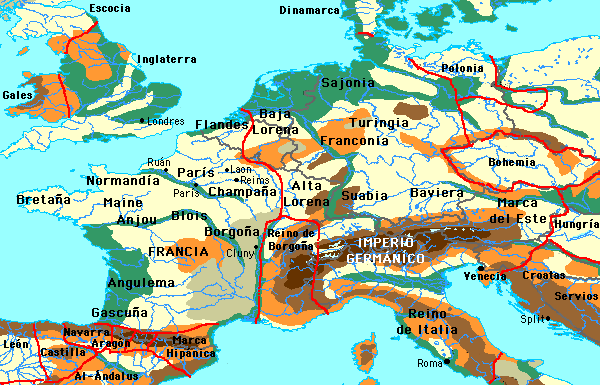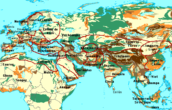 zoshi (Cuentos de cabecera).El Imperio Chino estaba gobernado por la dinastía Song. Era algo menos extenso que en tiempos de la dinastía Tang, a causa del Imperio Liao formado al norte por los khitán, que en estos momentos presionaban a Corea. No obstante, China pasaba por una de sus épocas más prósperas: el ejército se había sometido finalmente a la autoridad civil, el cuerpo de funcionarios fue revitalizado y se volvió al sistema de exámenes de acceso. Las materias principales eran tres: estilo administrativo, narración y poesía. Los exámenes podían durar hasta tres días. Los postulantes (después de haber sido registrados) eran encerrados en pequeñas celdas provistos de pincel, tinta y papel. Se valoraba mucho la caligrafía. Los manuscritos debían ser impecables, sin tachones ni añadidos, y todas las líneas debían contener el mismo número de caracteres. Surgió así el cuerpo conocido como los mandarines (consejeros), que se convirtieron en el eje del estado en detrimento de la familia real, eunucos y concubinas. No eran admitidos en el cuerpo actores, músicos, marineros, verdugos, carceleros o sus descendientes. El derecho progresó notablemente. Aunque no se llegó al principio de igualdad ante la ley, pues se distinguía entre ocho grupos sociales con distintos privilegios, se instauró la investigación de oficio y se reconoció el derecho a apelar una sentencia. El estado empezó a hacerse cargo de las tareas de asistencia social a pobres y enfermos, se descubrió la brújula y se empezó a usar la pólvora con fines militares. ![]() Los reinos del norte de la India impedían la penetración de los musulmanes, con lo cual protegían a los Chola, que dominaban el sur y habían formado una talasocracia que controlaba el comercio con occidente y con China. La talasocracia Srivijaya hacía de intermediaria entre la India y China. Entre la India y China estaba también el Tíbet, también de cultura budista, cuyos tiempos belicosos habían pasado ya. Al norte, los turcos estaban convirtiéndose al islam y ya habían formado dos estados islámicos poderosos: el de los gaznawíes y el de los karajaníes. Por otra parte, mercenarios turcos habían acaparado mucho poder en distintas partes de los disgregados dominios islámicos. El estado islámico más extenso era el Califato Fatimí. El Califa al-Hakim era un fanático que persiguió encarnizadamente a los cristianos, en particular a los coptos de Egipto. Al sur sobrevivía aún el reino cristiano de Aksum. Durante mucho tiempo tuvo que replegarse hacia el sur, lejos de la costa del mar Rojo, ocupada por los musulmanes, pero recientemente había ganado de nuevo la costa. El estado ruso de Kíev vivía tiempos de esplendor bajo el Gran Príncipe Vladimiro. Otro tanto podía decirse del Imperio Bizantino, gobernado por el emperador Basilio II. Vladimiro le había proporcionado unos años antes un contingente de mercenarios con los que pudo resolver sus problemas internos y puso a raya a los búlgaros. Formaron la llamada guardia varega, que en el futuro se alimentó de mercenarios de las más diversas procedencias. Ahora el emperador se puso al frente de su ejército para invadir Bulgaria. La fortaleza militar de Constantinopla contrasta con un primer indicio de debilidad: en la capital se había instalado una colonia de comerciantes venecianos en una situación de privilegio. Los venecianos tenían una lengua y una cultura muy diferente de la bizantina. Venecianos y bizantinos se despreciaban mutuamente, se producían continuos conflictos y por ello los venecianos pidieron al emperador un status extraterritorial, es decir, pidieron (y consiguieron) ser regidos por sus propias leyes y estar exentos de los tributos imperiales. Desde un punto de vista económico, la gran Constantinopla se convirtió en una colonia veneciana donde los mercaderes obtenían dinero fácil. Naturalmente, la contrapartida para el Imperio era el apoyo logístico de la flota veneciana. Las ciudades bizantinas del Adriático, pese a formar parte del Imperio, pidieron a Venecia que las protegiera frente a los croatas, así que el dux Pietro Orseolo extendió sus dominios hasta Split, a la que los italianos llamaban Spalato. En Europa occidental se estaban produciendo cambios muy significativos. Naturalmente fueron graduales, pero los historiadores consideran el año 1000 como una buena fecha en la que fijar el final de la alta edad media y el inicio de la baja edad media. Entre los factores que propiciaron dichos cambios estaban varios adelantos en la agricultura: Durante mucho tiempo, los campos se araban principalmente con bueyes. Los caballos no eran tan apropiados, porque los arneses les ahogaban y no podían tirar con demasiada fuerza. A principios del siglo X empezó a usarse la collera, que evitaba este problema, y así resultó que un caballo podía de repente hacer el trabajo de varios bueyes. También se empezaron a usar las herraduras. Otro adelanto fue el arado de vertedera, que penetraba más profundamente en la tierra y la echaba a un lado formando un montículo al lado de un surco. Esto hacía que el agua de riego se aprovechara mejor y multiplicaba la fertilidad de la tierra. El aumento de la productividad agrícola trajo consigo un mayor crecimiento demográfico y un aumento de la riqueza. Por supuesto, la riqueza no se distribuyó equitativamente, sino que hizo que los señores fueran más ricos, tuvieran a su disposición más caballos y más soldados. En Alemania ello contribuyó a que los ejércitos de caballeros pudieran contener a las hordas de húngaros y eslavos. En Francia, en cambio, donde no había muchos enemigos exteriores, el efecto principal fue que los señores lo tuvieron más fácil para pelearse entre sí por motivos cada vez más insignificantes. Ésta fue una de las razones por la que los eclesiásticos tuvieron interés en promover la tregua de Dios y en apoyar a una monarquía que pudiera unificar el paí