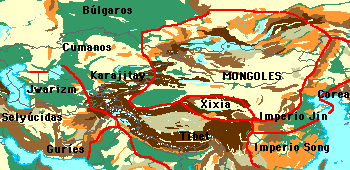 También murió el sultán Muhammad de Gur, y uno de sus esclavos, el turco Qutb al-Din Aybak, que gobernaba en Delhi, se proclamó sultán independiente de los dominios guríes en la India. El sultanato fue extendiendo rápidamente sus fronteras y con él penetró el Islam en el norte de la India. El kan mongol Timuyin dominaba ya todo el territorio que actualmente se conoce como Mongolia. Su capital era la ciudad de Karakorum. Reunió en una asamblea a los jefes de todos los clanes que había sometido y éstos lo nombraron Kan Universal (Gengis Kan), y con este nombre es recordado en la Historia. Se le atribuyen estas palabras: Aquellos que compartan mi fortuna, y cuya lealtad sea transparente como el cristal, quiero que sean llamados mongoles, y su poder superará a todo lo que vive. De